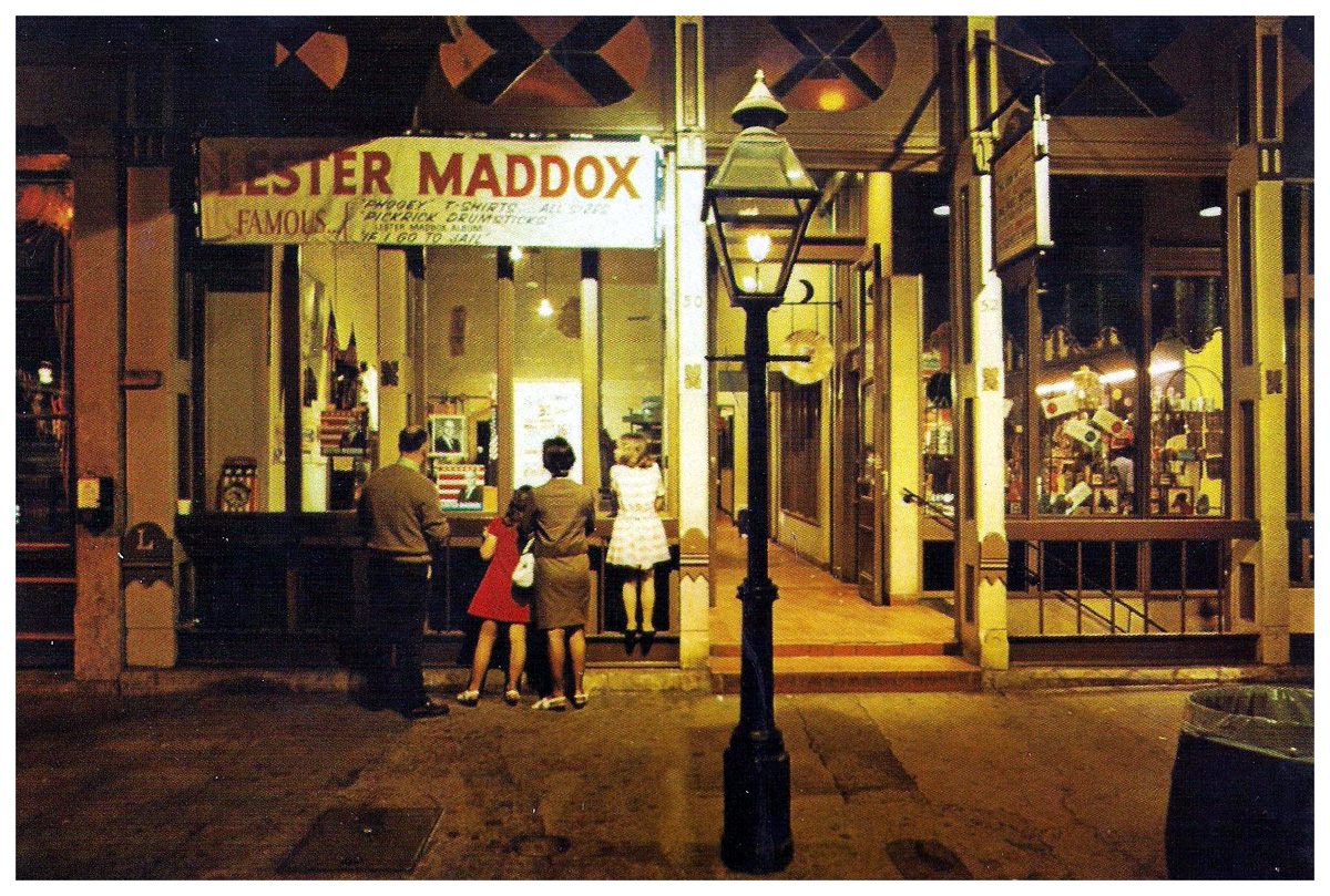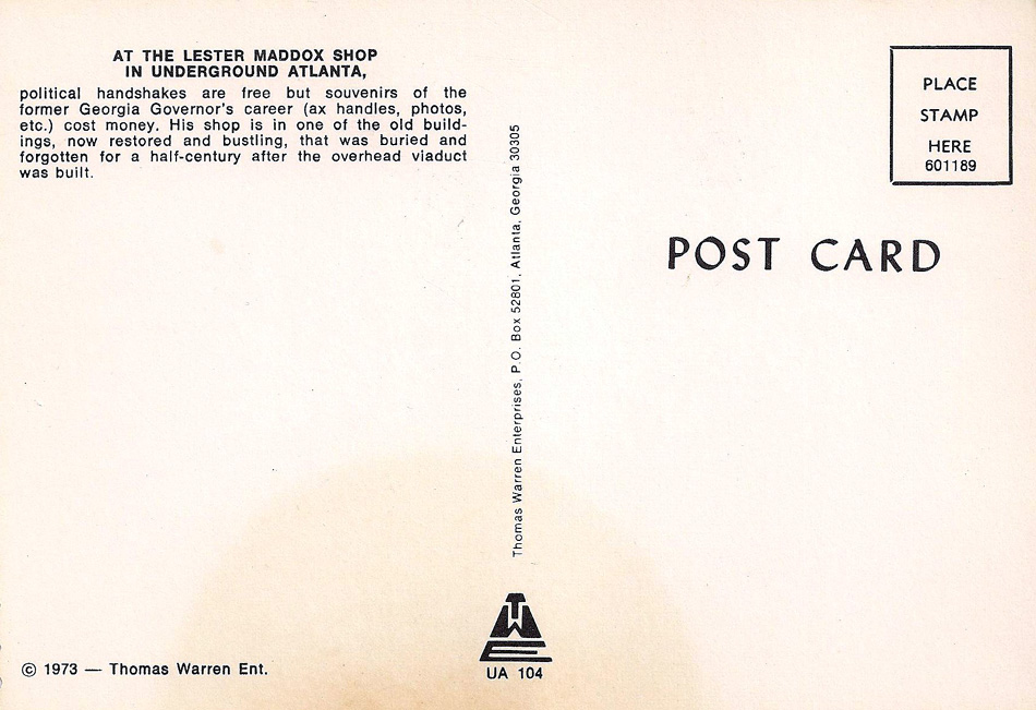 Featured on this 1973 postcard is a photo of the souvenir store run by former Governor Lester Maddox in Underground Atlanta. Among the items for sale were ax handles (adopted by Maddox as a symbol of his defiant resistance to integrating his Hemphill Avenue restaurant, The Pickrick), buttons, photos, recordings of his speeches, "time to wake up!" politically-themed alarm clocks, etc. Despite his roots as a segregationist, he is credited with a surprisingly progressive record during his time as Governor. Civil Rights activist Hosea Williams, in fact, told the British newspaper The Guardian that Maddox did more for black people than any other Governor of the state.
