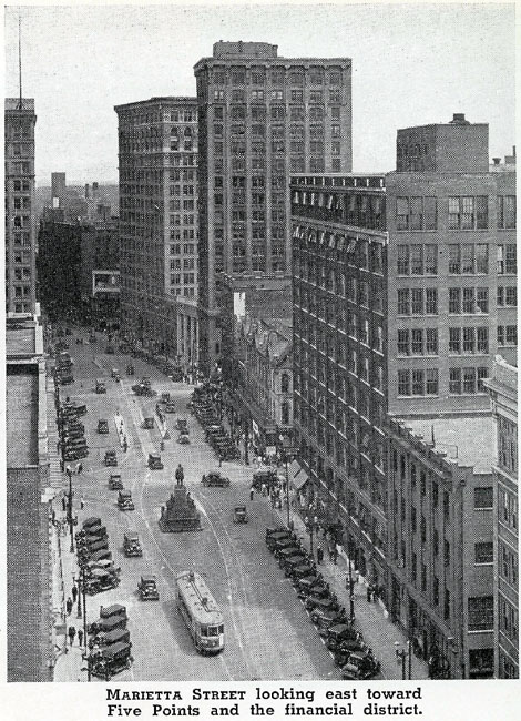 This photo, published in a brochure put out by the Atlanta Chamber of Commerce in 1934, shows an aerial view of Marietta Street, including the statue of Henry W. Grady. Date: 1934