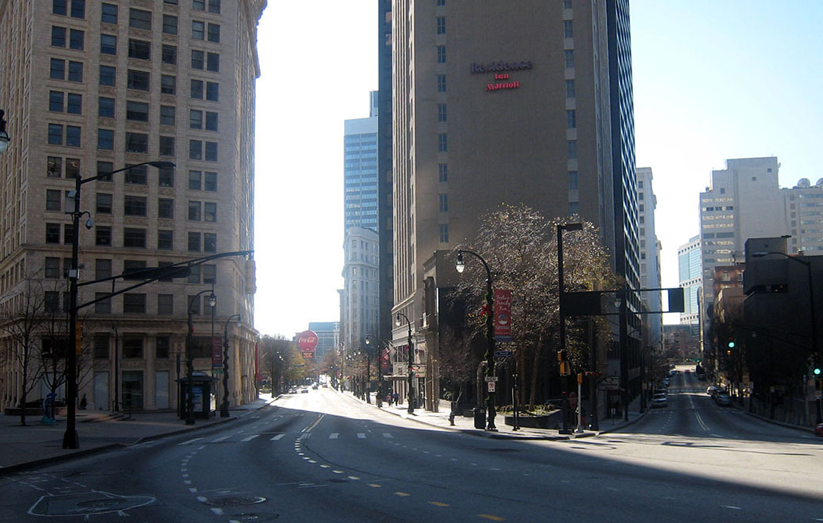 Lower photo: December 2011. In the distance a Coca-Cola sign can be seen at Five Points that is a nod to the one seen in the postcard above.
