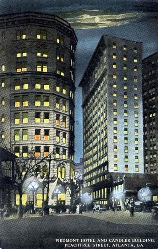 The postcard below shows the Piedmont Hotel and the Candler Building. As noted elsewhere, the Piedmont Hotel was torn down in the late 60s to make way for the Equitable Building, which now stand on the site. Google map