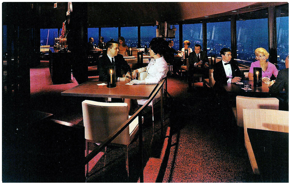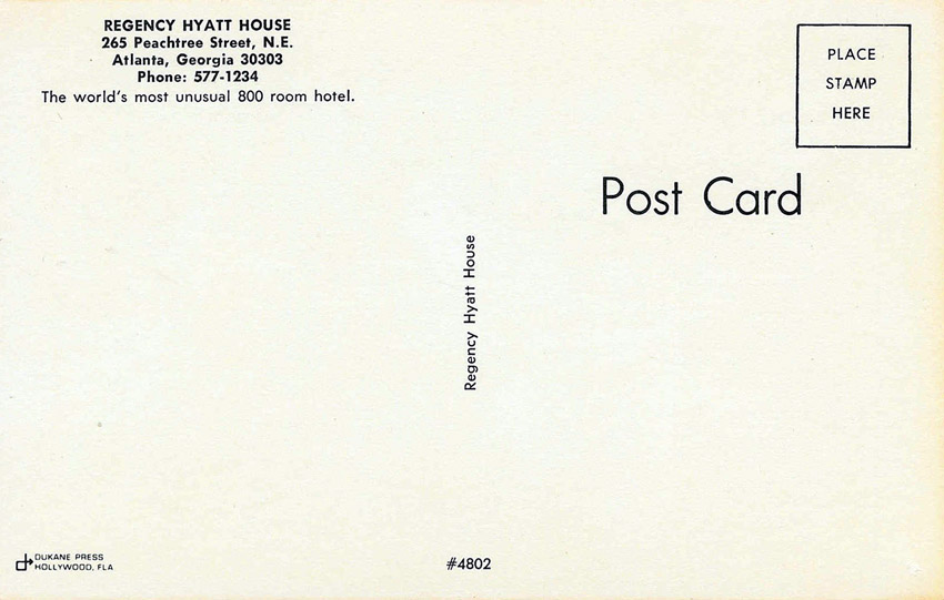 Featured on this postcard is a photograph of the interior of the Polaris Restaurant high atop the Regency Hyatt House hotel at 265 Peachtree Street. The Polaris, a revolving restaurant, was instantly recognizable by its distinctive blue dome. The restaurant has been closed since approximately 2005.