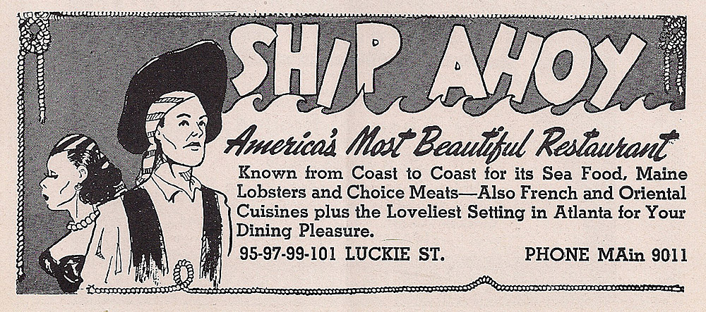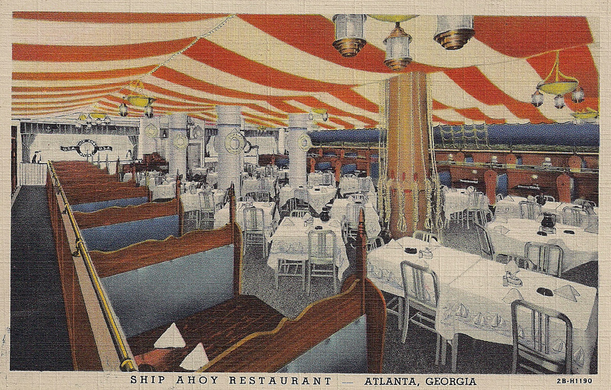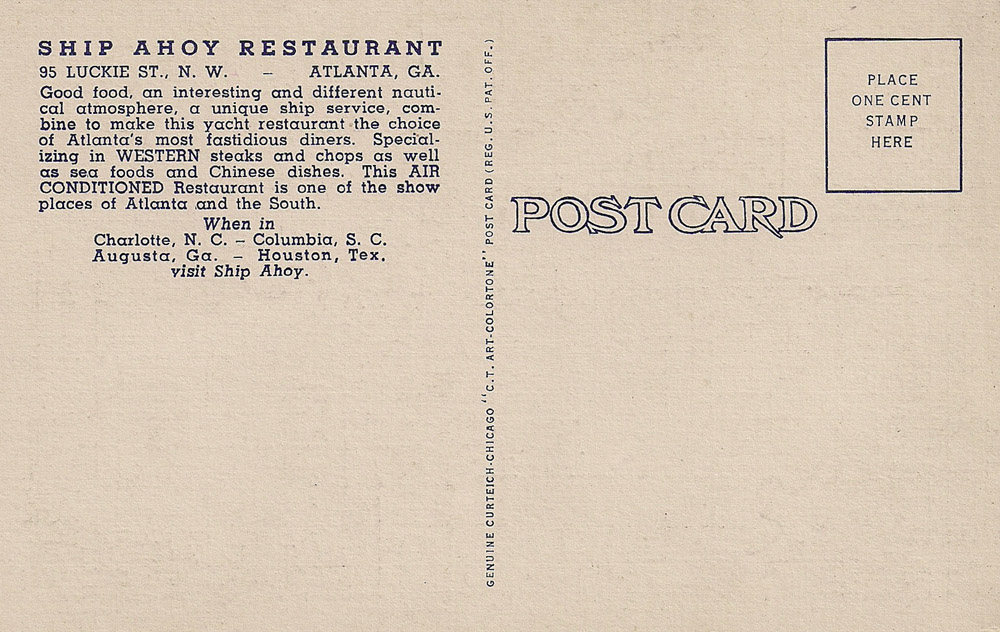 This circa 1940s postcard shows the elaborately ornate aquatic-themed interior of the Ship Ahoy restaurant, located at 95 Luckie Street. If you scroll down, in addition to seeing the back of the card, you'll find a 1953 advertisement for the Ship Ahoy and a 1956 photo of Luckie Street, which shows the restaurant's exterior and eye-catching sign. The 1956 photo appears here courtesy of the Ga. State University Library Archives, file #N05-079a. Google map