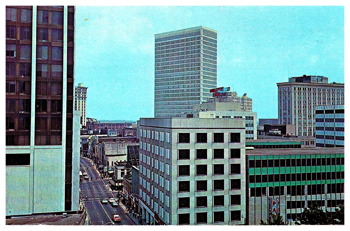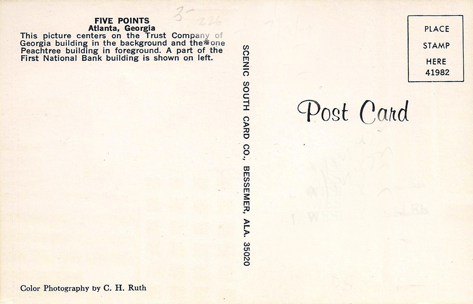 The postcard below shows a view looking to the northeast toward Five Points and beyond. I don't know the precise year, but it's definitely 1969 or later as the Trust Company Tower, the large white building in the middle of the photo, was completed that year. These days it's known as the SunTrust Tower, and its current owner, Georgia State University, has owned the property since 2007. As Maria Saporta reported for the Atlanta Business Chronicle, the $52 million purchase also included a three-story bank building, a six-story annex building, a four-story vacant building and an eight-story parking deck.