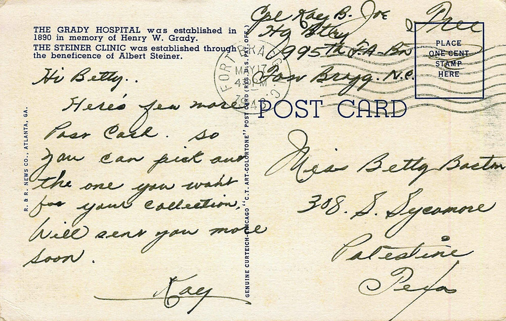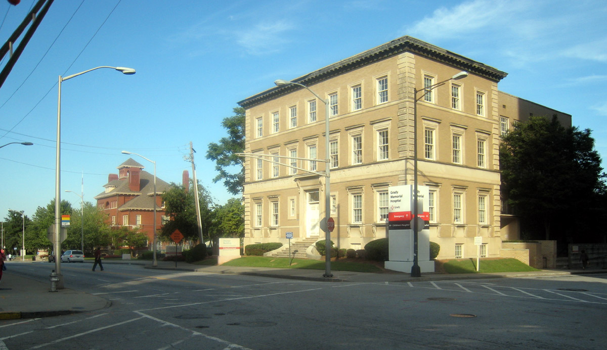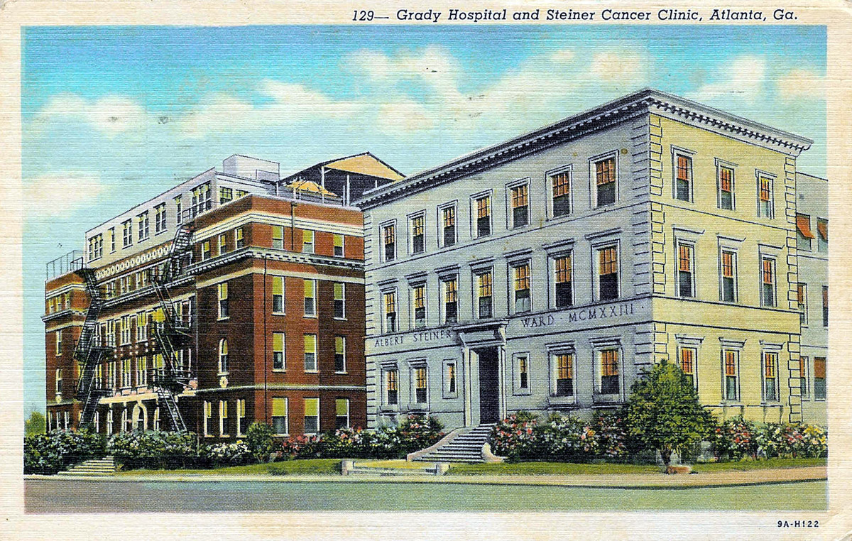 Seen below is a postcard featuring the Steiner Cancer Clinic, built in 1922 to be a part of Grady Hospital. The building was designed by the Hentz, Reid and Adler architectural firm. The building, located at 62 Jesse Hill Junior Drive SE (formerly Butler Street), still stands in the shadow of the main Grady Hospital building. Google map