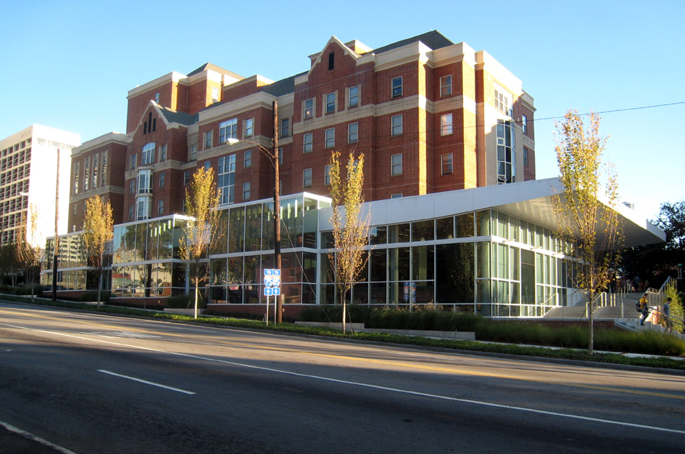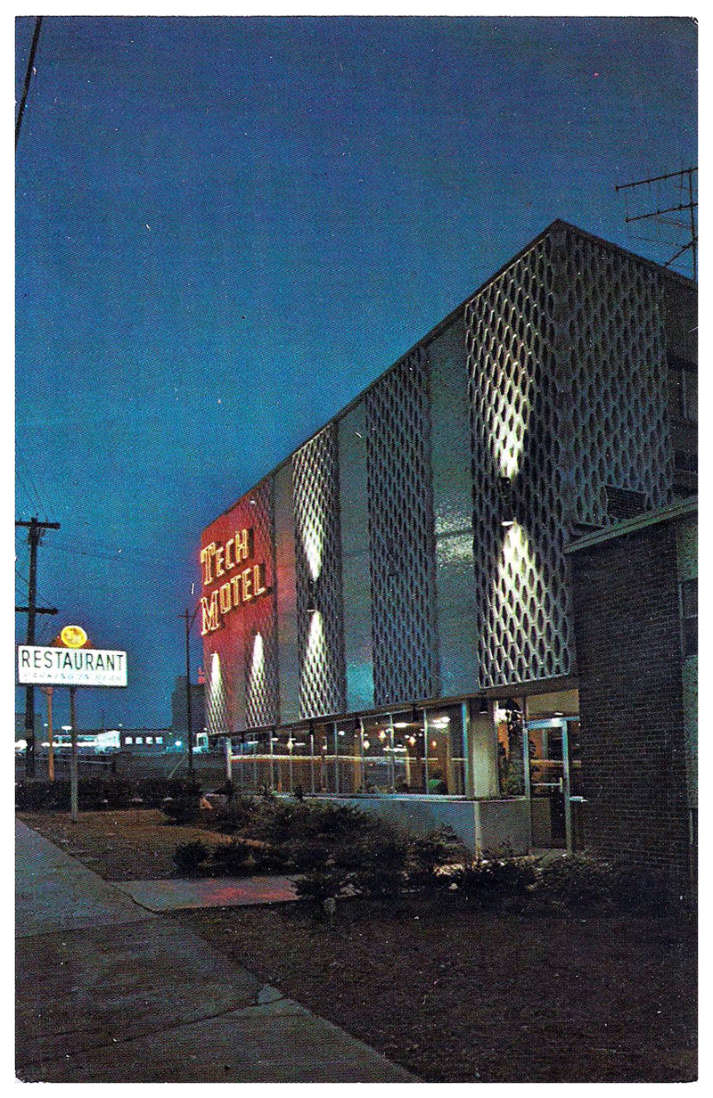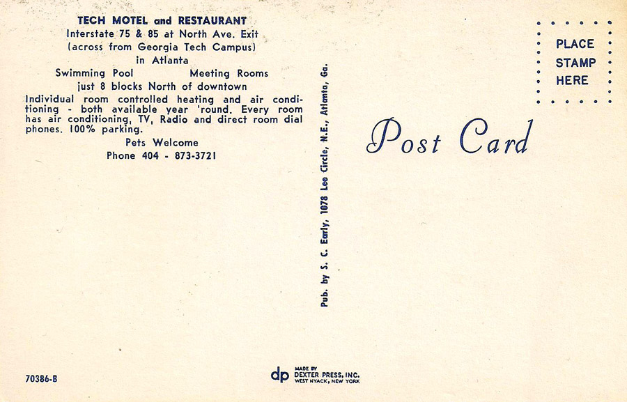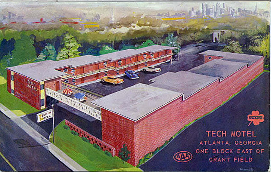The Tech Motel, seen in two postcards below, stood on the south side of North Avenue, just across the street from Georgia Tech's Smith Hall, a freshman dormitory. The property is now part of the Georgia Tech campus.