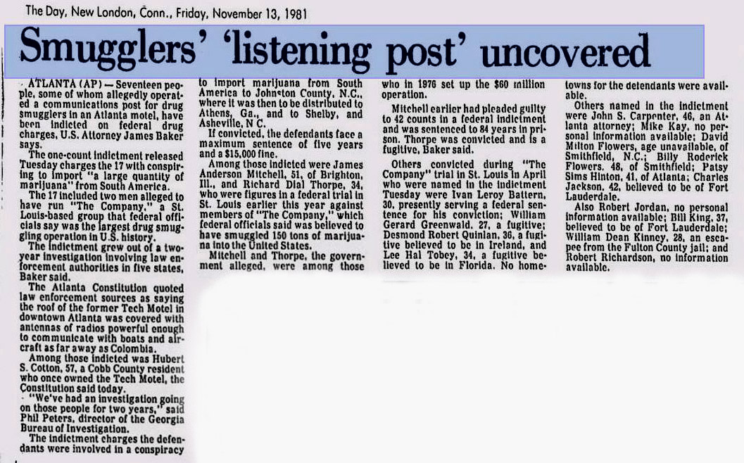 In 1981, after the motel had closed, but before its demolition, the building's owner, Hubert S. Cotton of Cobb County, was one of 17 people arrested and charged with conspiracy to import marijuana from South America. According to the newspaper article below, the roof of the motel "was covered with antennas of radios powerful enough to communicate with boats and aircraft as far away as Columbia." The group was believed to have smuggled up to 150 tons of marijuana into the country.