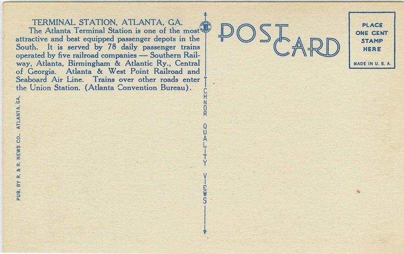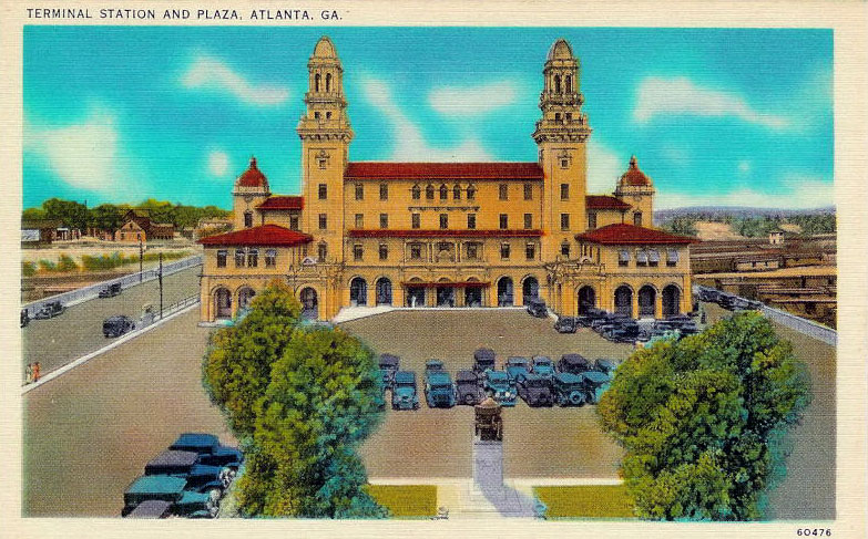 Terminal Station, designed by architect P. Thornton Marye was built in 1905 and was demolished in 1972. The statue visible in the foreground of the postcard is Samuel Spencer (1847 - 1906), founder of the Southern Railway. The statue has been moved but remains in Atlanta and since 2009 has been located at the Southern Railway headquarters at 1200 Peachtree Street. Scroll down for a photo taken in 2008, when it was parked at Hardy Ivy Park. Back to thumbnails Google map