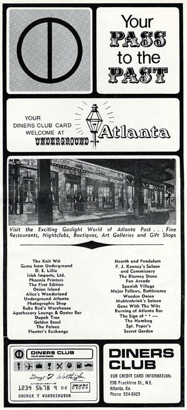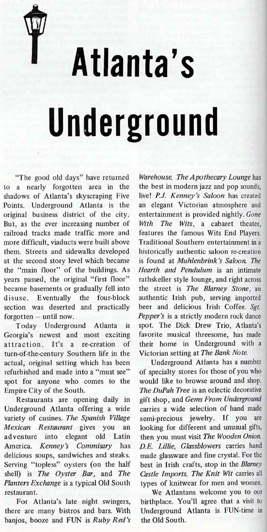 The short piece on the right was published in June 1970 in FUN magazine, which covered entertainment, dining, theatre, and sports for Atlanta fun seekers. The Underground advertisement on the right appeared in a similar publication called WHERE and was published in September 1970. Main Underground page.