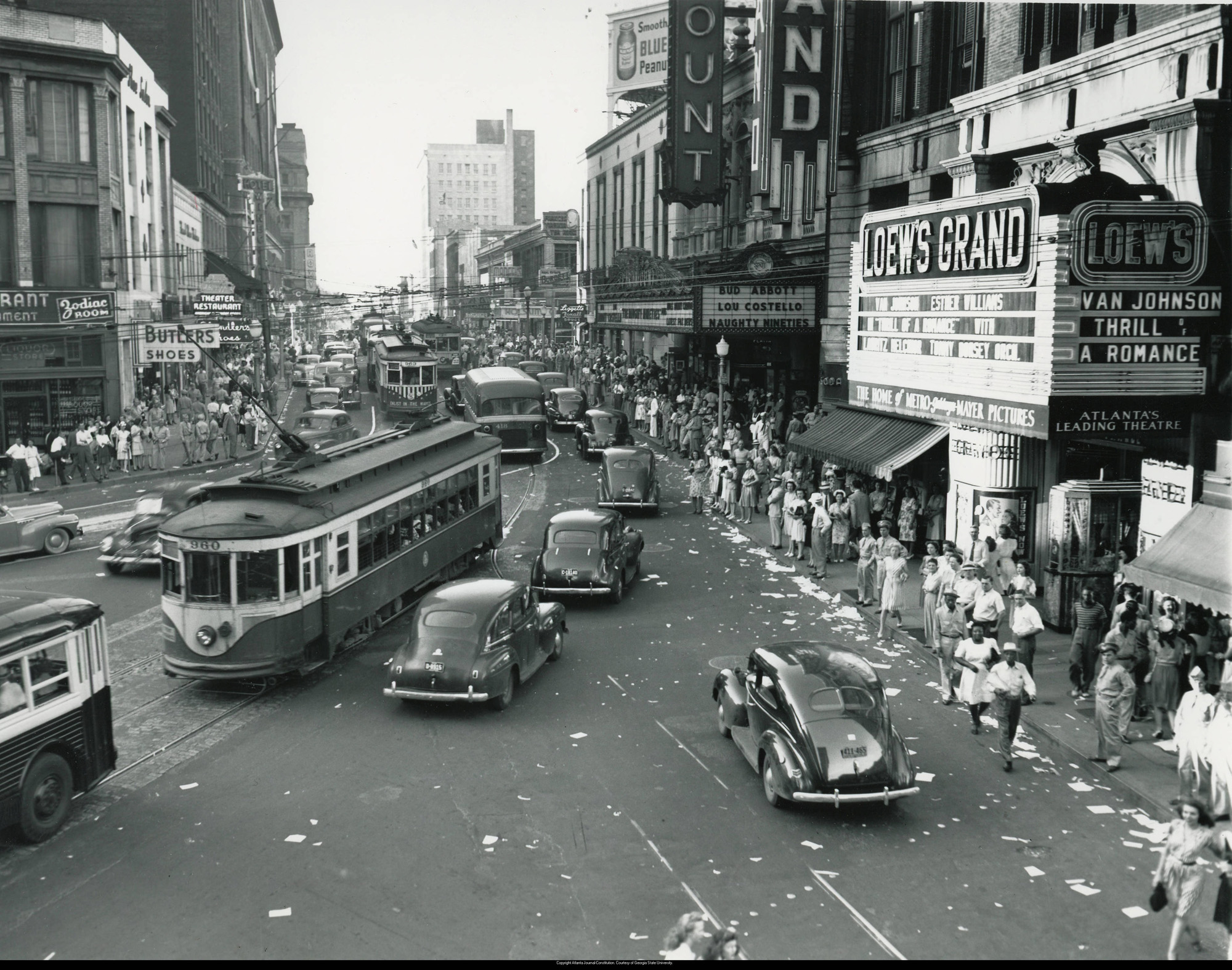 This August 14, 1945 photo shows the city celebrating Victory Over Japan Day (VJ Day), marking Japan's surrender in World War II. We're looking north along Peachtree Street from a location near its junction with Forsyth Street. Via the Georgia State University Library Archives, file #AJCP144-065l. Google map