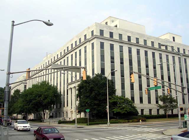 Trinity Street SW at Washington Street SW. This view looks to the north along Washington Street. The building shown houses state government offices. Date: No date listed. Mid 1950's would be my guess, though, based on the automobiles.