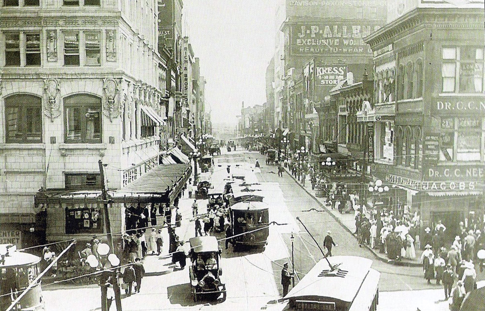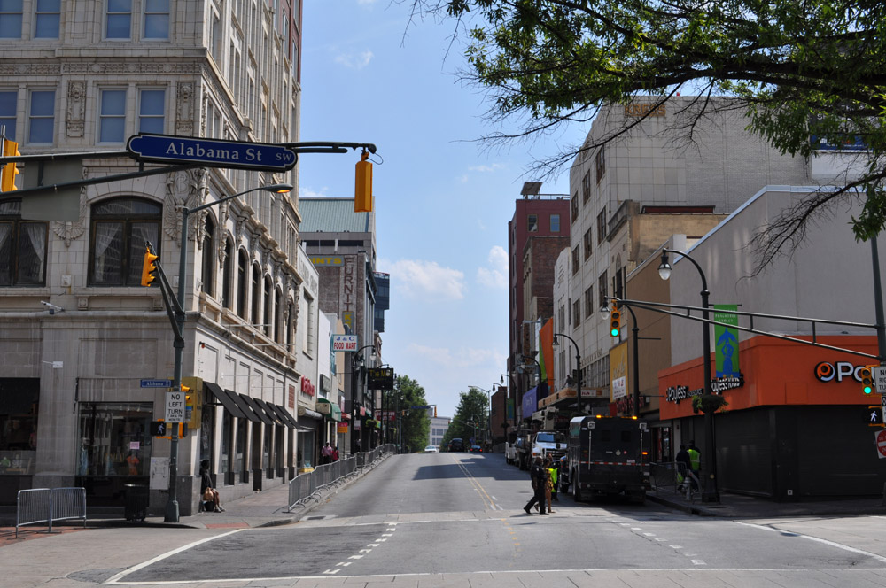 Jeff Morrison: Whitehall (now Peachtree) and Alabama St, facing south. Visible at the corner on the left is the Connally Building (1916) with its distinctive terracotta medallions. The second floor was redesigned as the main entrance after the street was elevated in the construction of the viaduct. For most of its life the building was only five stories tall, all of the brick-clad upper floors were not added until sometime in the 1980s. Google map