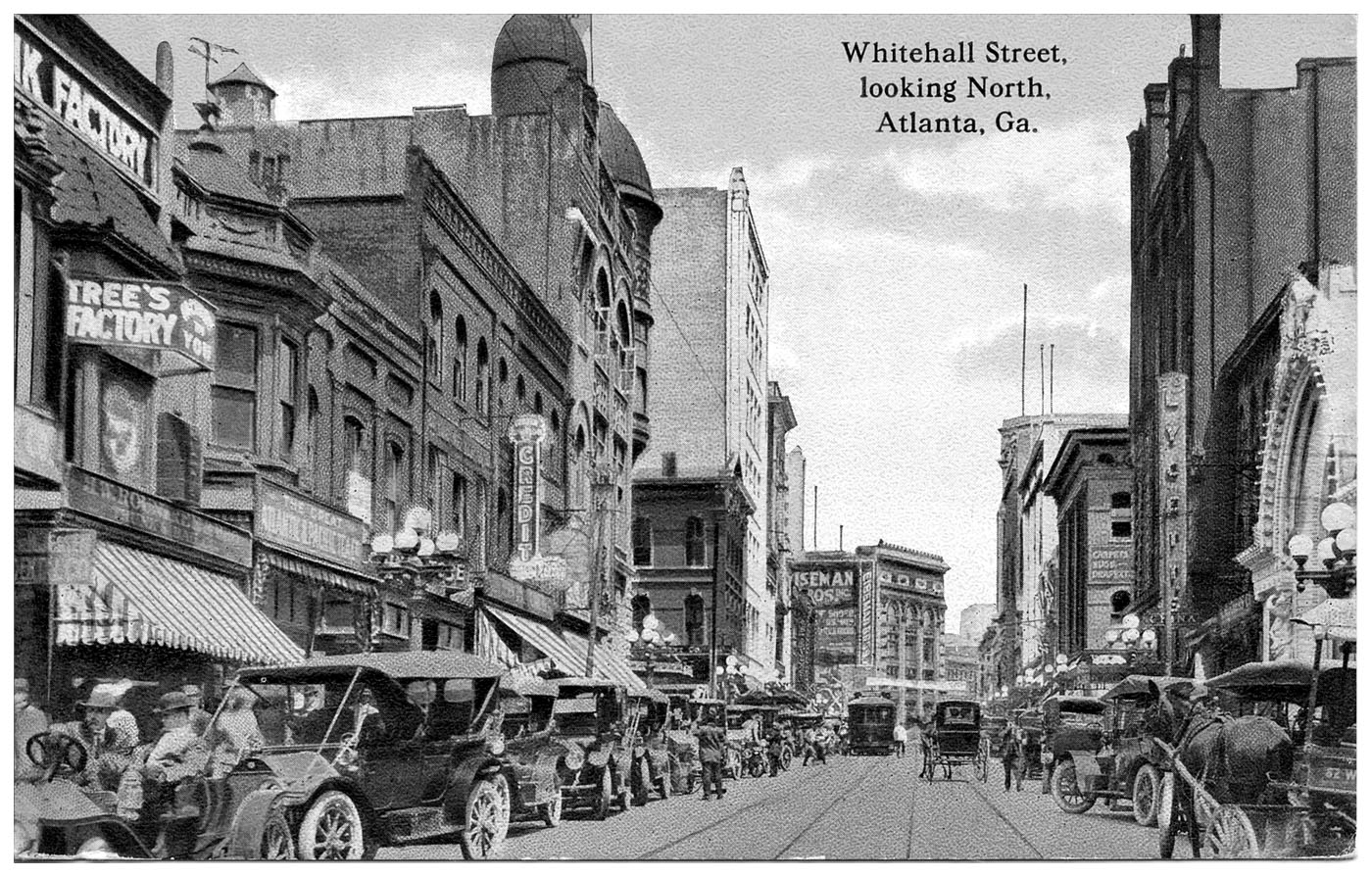 This postcard looks north along Whitehall Street (now Peachtree Street) toward Five Points. Near the middle of this image is the Eiseman Builing, easily identified by its trio of large arched windows. Built in 1901, it was leveled in 1975 to make way for the Five Points Marta station. A portion of the building's facade was partially reconstructed inside the station. Flickr photo by LI Refugee.