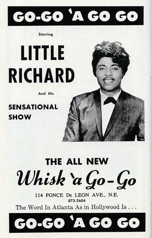 The week of 4/11/66, Little Richard appeared at the Whisk A Go-Go, located at 114 Ponce de Leon Avenue (Google Map). By 1968 this club had moved several blocks south & set up shop in the Imperial Hotel. Back to index of go-go ads