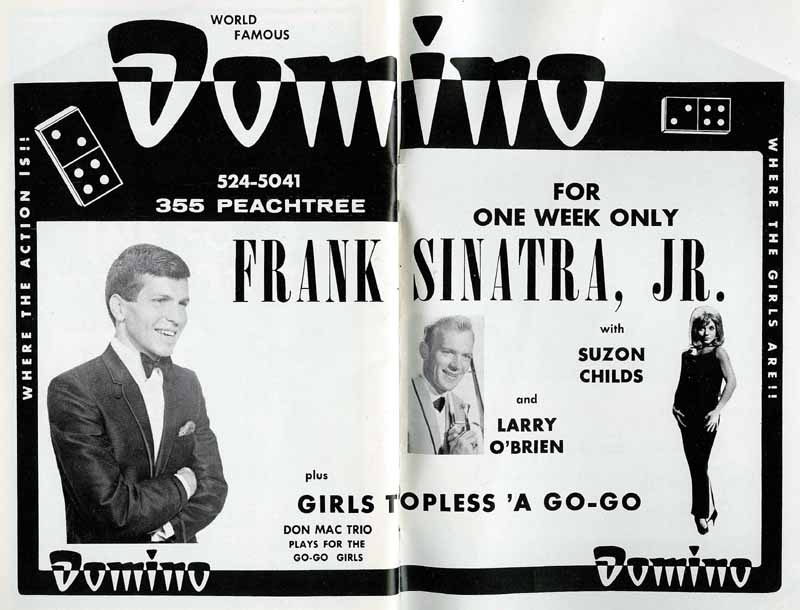 Date: 10/02/67 Back to index of go-go ads Frank Sinatra, Jr. was responsible for the serious entertainment at the Domino Lounge, while the ad informs us that the go go girls came out to do their thing to the sounds of the Don Mac Trio. More advertising for the appearance of Frank Sinatra, Jr. can be seen here. |