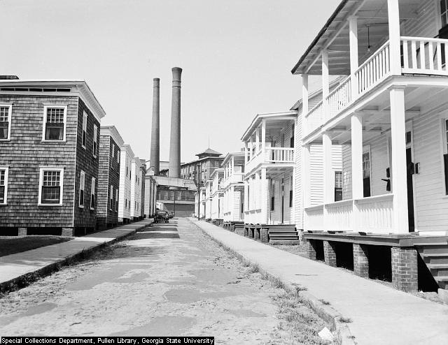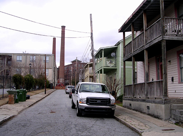 Cabbagetown: This view looks to the northeast along Reinhardt Street SE and toward the old smokestacks of the Fulton Bag and Cotton Mill. Date: No date listed