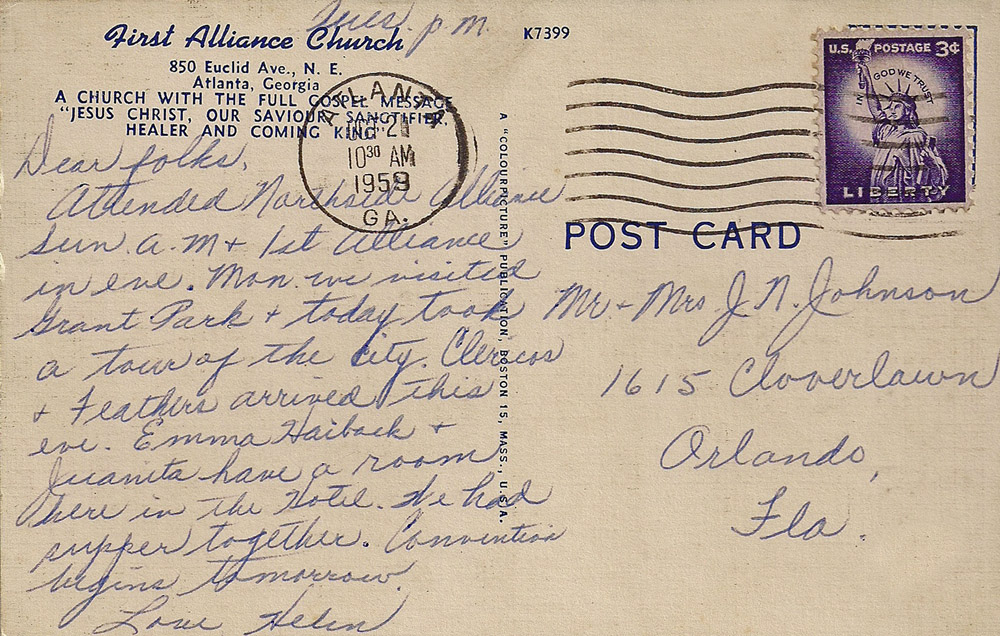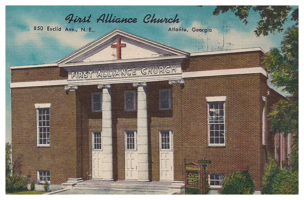 The First Alliance Church at 850 Euclid Avenue NE is no longer operating, but the building still stands in Inman Park, very near the intersection of Euclid Avenue and Edgewood Avenue. I'm not sure when the church closed down, but I see that there is a First Alliance Church currently operating on North Druid Hills Road, though I'm not sure if they're connected to the church seen here or not. The vacant building was slated to be turned into a loft/condo development but it looks like those plans may have been shelved for the moment. There used to be sign, visible in the bottom photo, posted out front proclaiming that this was the site of the forthcoming Lizzie Chapel Lofts project, but the sign now leans against the side of the entrance and the website referenced on the sign seems to be down. Google map