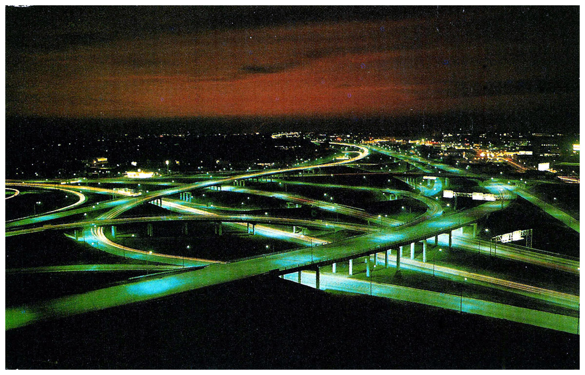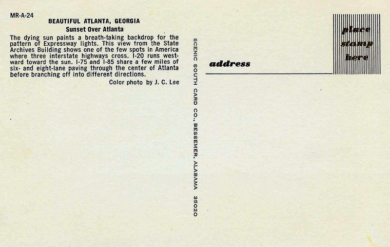 This postcard shows the view looking west (from the roof of the former State Archives building) toward the intersection of I-20, I-75 and I-85. According to the information on the back of the card, this is one of the few places in America where three interstate highways connect. This page features a photo showing the same view on a bright sunny day.