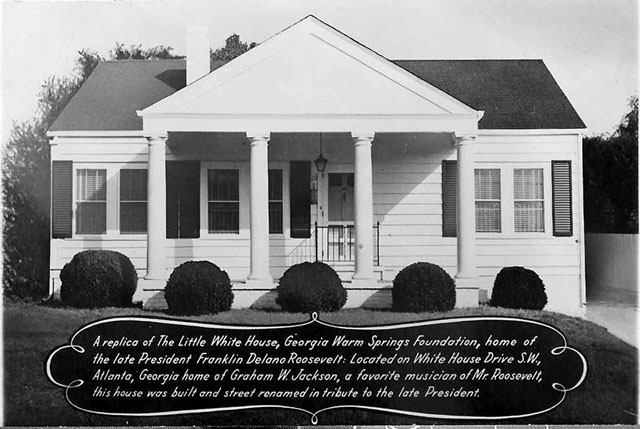 BACK TO GRAHAM JACKSON THUMBNAILS 60 White House Drive SW This postcard is where I originally learned of the existence of an Atlanta replica of FDR's Little White House in nearby Warm Springs. Curiously, even though the street was renamed (from Abbott Street) to honor the presence of this house, I have never seen any Atlanta history or reference books mention this architectural curiosity. For those interested in checking it out, it is can be found one block south of Martin Luther King Jr. Drive and is directly across the street from Booker T. Washington High School, the first high school in Atlanta built for black students, which opened in 1924. Incidentally, Jackson served as Musical Director at Washington High School from 1928 - 1940. Date: Unknown