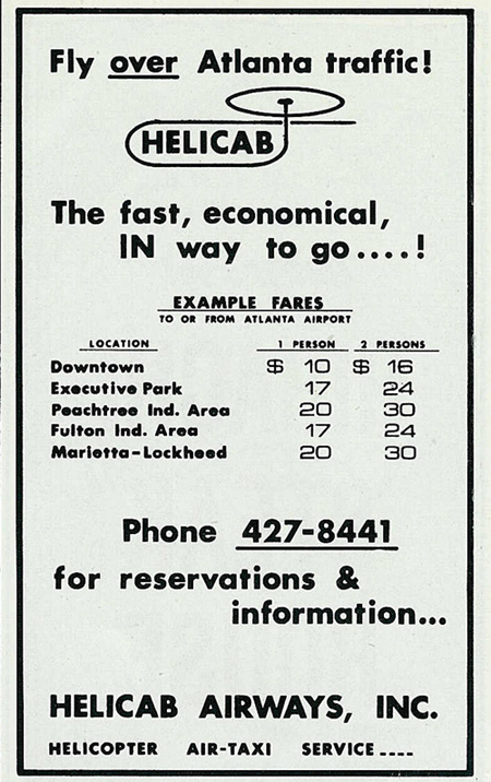 Here's an ad from August 1969 touting helicopter rides from various spots down to the Atlanta airport. Even 40 years ago, traffic was enough of a hassle to make such a service feasible. Interestingly, I don't think such an option now exists which is a little counter intuitive, seeing that traffic is now presumably far worse it was in 1969.