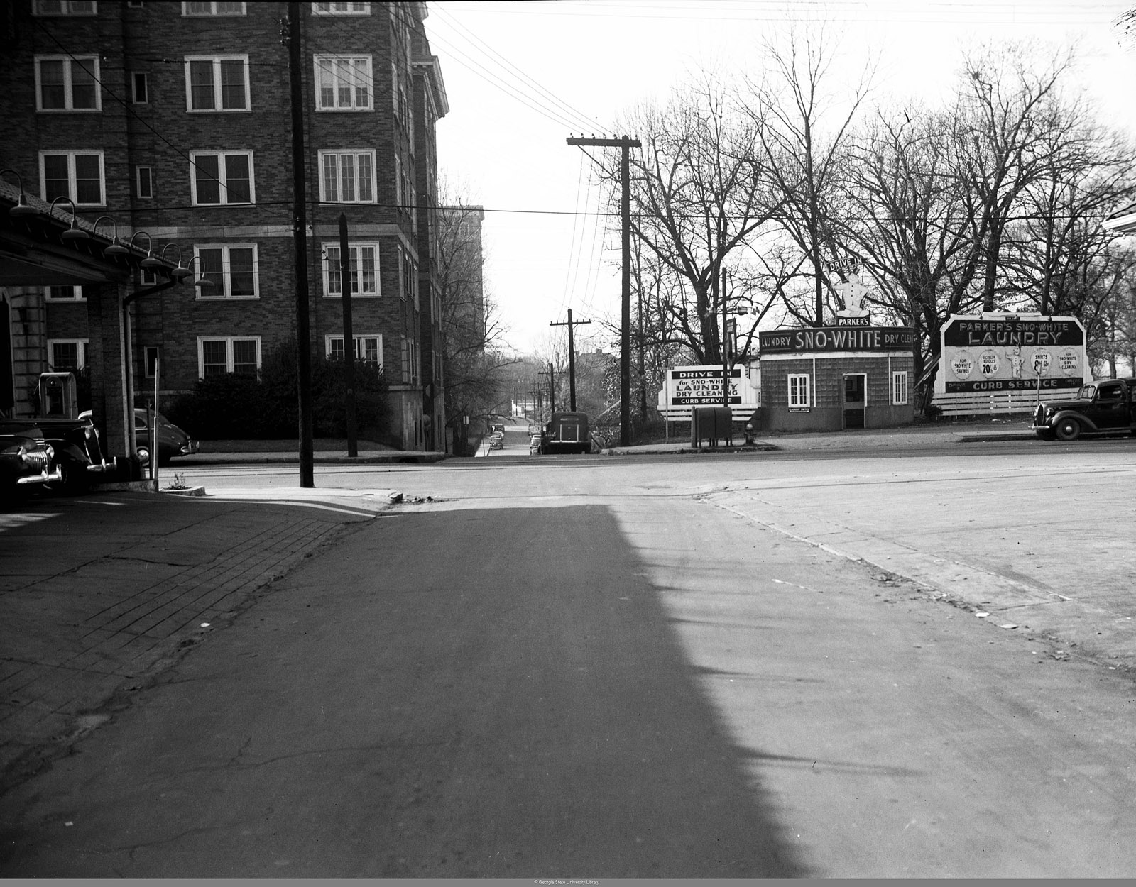 6th Street looking west toward Peachtree Street, in the 1940s. The large brick building on the left is the Peachtree Manor Hotel and behind it is the Biltmore Hotel. Also worth pointing out is the small circular Sno-White Laundry building that sits at the NW corner of the intersection. I don't think I've ever seen another photo of that.