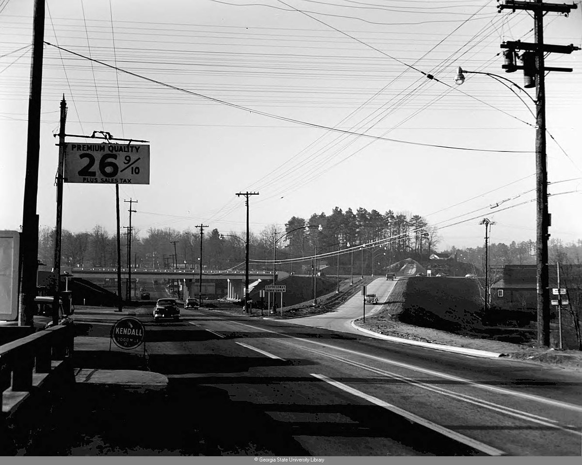 This 1954 photo shows Piedmont Road looking south toward the on-ramp for the southbound lanes of what was then known as the Northeast Expressway. Today, the road has been greatly expanded and is Interstate 85. Courtesy of the Georgia State University Library Archives, file #LBGPNS5-042l. Google map