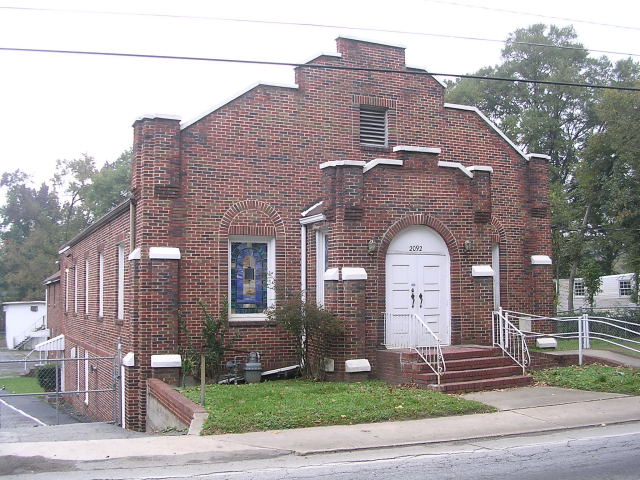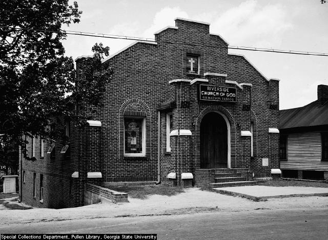 Riverside Church of God at 2092 Bolton Road. The church was built 9 years earlier, in 1938, under the direction of Reverend G.R. Watson, as indicated by an engraved stone set in the front wall of the church. Date: