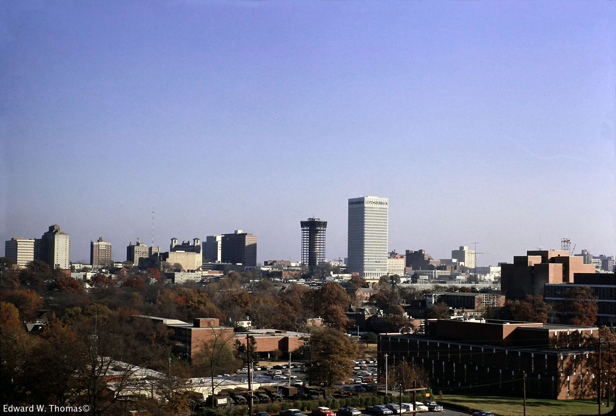 This photo, taken in the fall of 1967 from the roof of the brand-new Physics Building on the Georgia Tech campus, shows the view looking south and east toward the vicinity of Peachtree Street and Ponce de Leon Avenue, about where downtown gives way to midtown. The Life of Georgia Building, which officially opened in 1968, looks to the naked eye from this distance like it may already be more or less complete. And just to the left of the Life of Georgia Building, we can see the spine of the circular C&S Bank tower as it's being constructed.