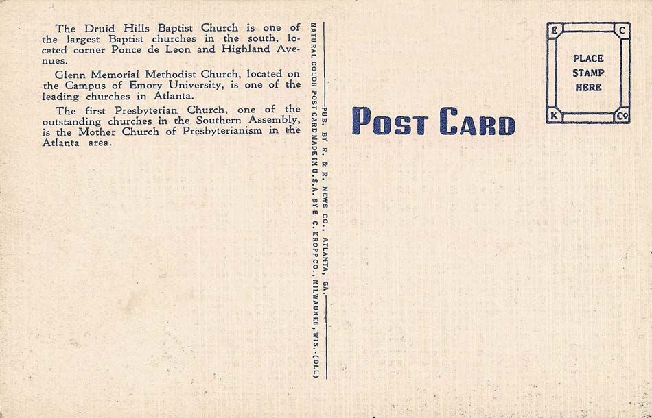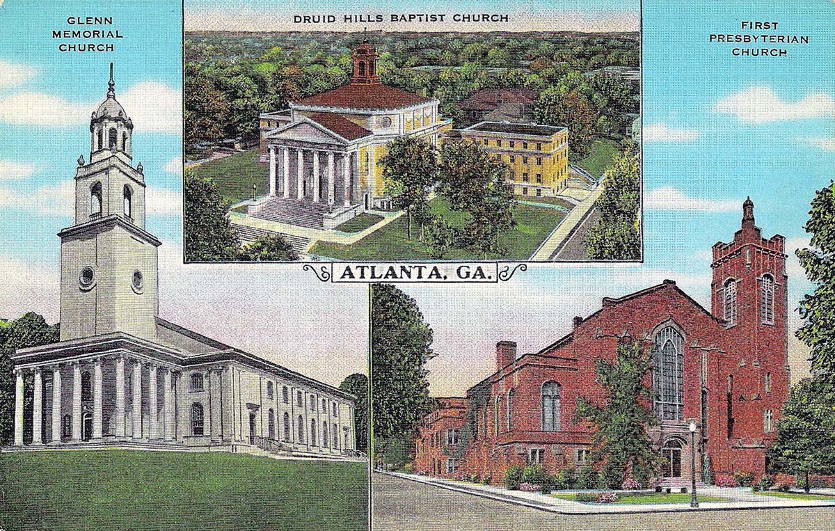 All of these churches have pages of their own here on the Atlanta Time Machine. More about the Glenn Memorial Methodist Church can be found here and you can find out more about the Druid Hills Baptist Church here. And click here for more information on the First Presbyterian Church on Peachtree St. in midtown.